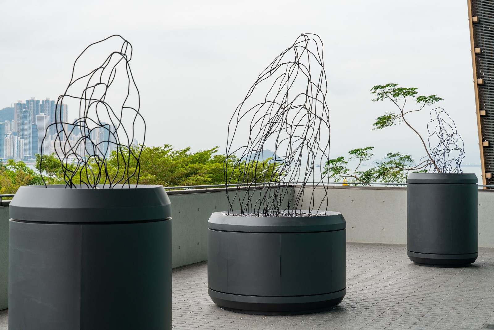 何兆基介紹,其作品是鐵枝,透過「屈、扭和燒焊」的方式製作。由於鐵枝具有通透性,可與背後的建築物、天際線形成有趣的關係。他指出,在展品放置的地點,其四周環境一直改變,原本可看到更多海洋,但現時外圍的樹木長高了很多。