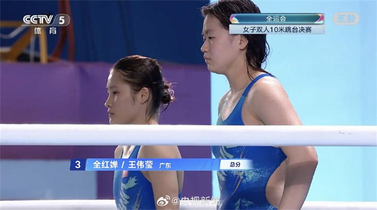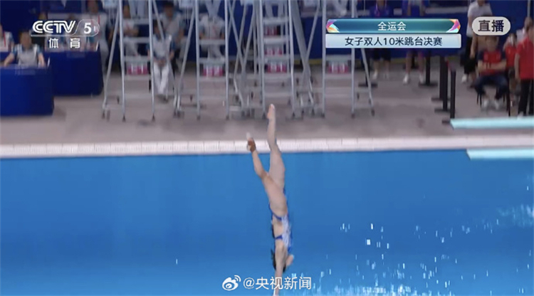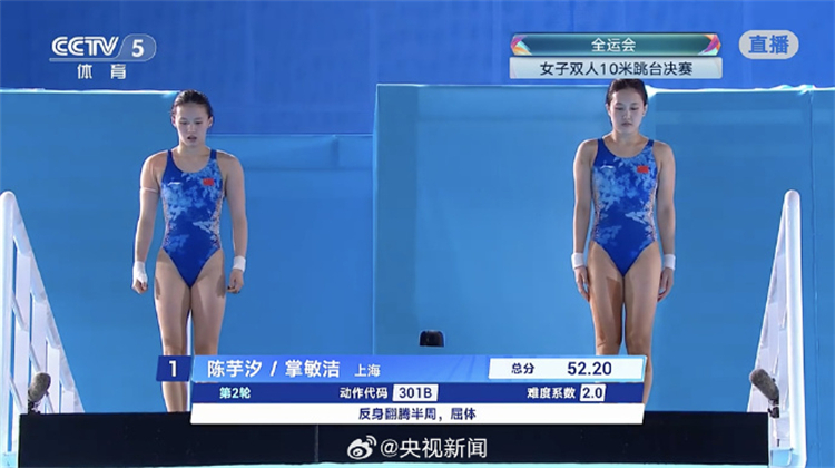 第十五屆全國運動會跳水項目女子雙人10米台決賽6日晚在廣東奧林匹克體育中心舉行,最終,上海隊組合陳芋汐/掌敏潔以350.22分奪得金牌,四川隊組合李蕊汐/盧為以322.44分奪得銀牌,江蘇隊組合劉軍熙/孟澤瑞以316.44分摘銅。廣東隊組合全紅嬋/王偉瑩獲得第五名,成績為311.76分。(圖片截自央視節目)