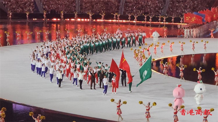 第十五屆全國運動會開幕式今晚(9日)在廣東奧林匹克體育中心舉行。在運動員入場儀式中,廣東、香港、澳門三地運動員作為本屆全運會東道主,一齊壓軸出場,全場瞬間沸騰,觀眾歡呼聲此起彼伏!