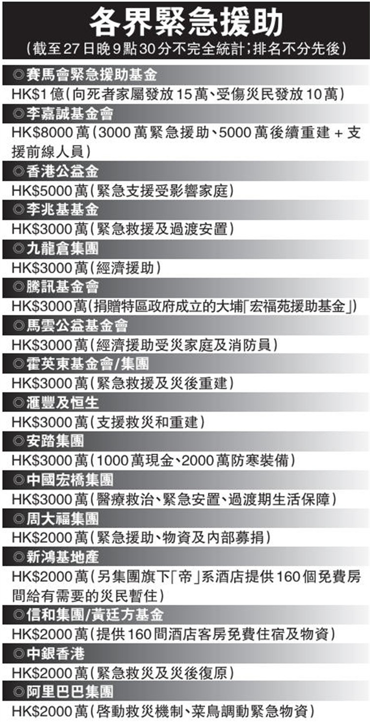 【21:00】多家內地企業及人道組織,以及本港多家基金會及商界集團,均相繼撥款協助災民渡過難關。眾志成城,在短短一天之內,善款已累計超過5億元,至於救援物資更是不計其數。