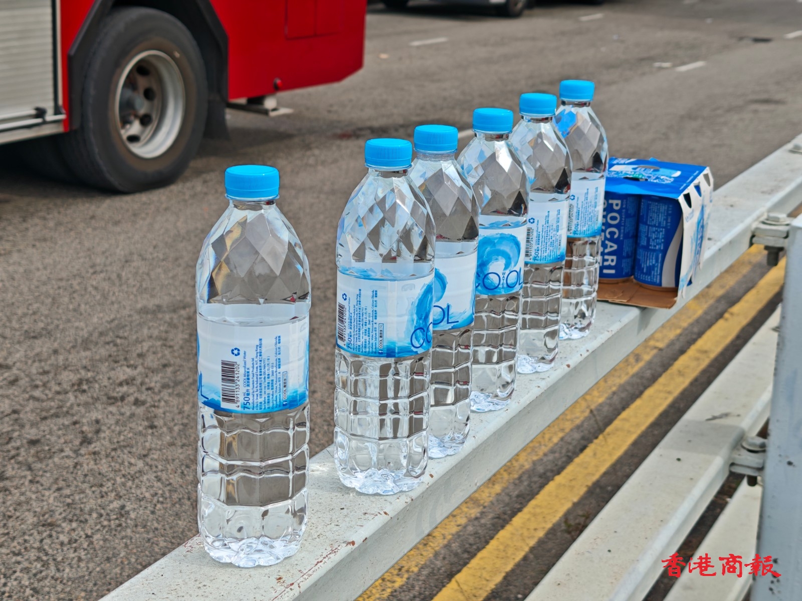 火災附近有人放置清水及運動飲品供附近消防員飲用。林駿強攝