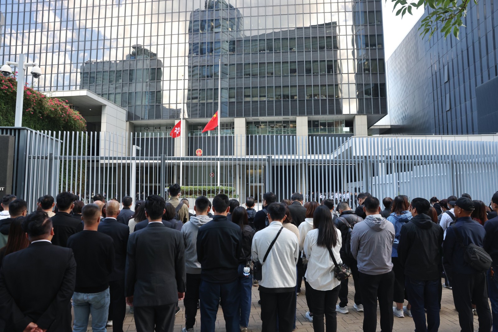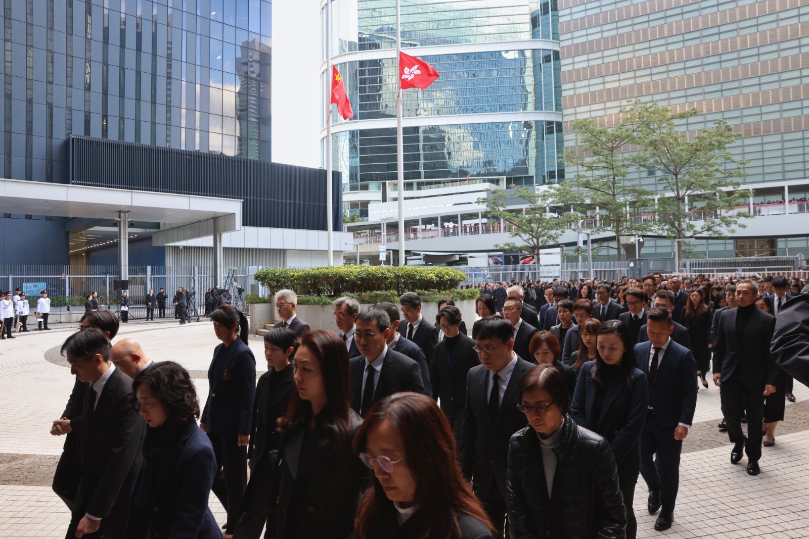 政府總部外圍及附近天橋上亦聚集大批市民,眾人肅立觀禮弔唁遇難者,氣氛莊嚴肅穆。