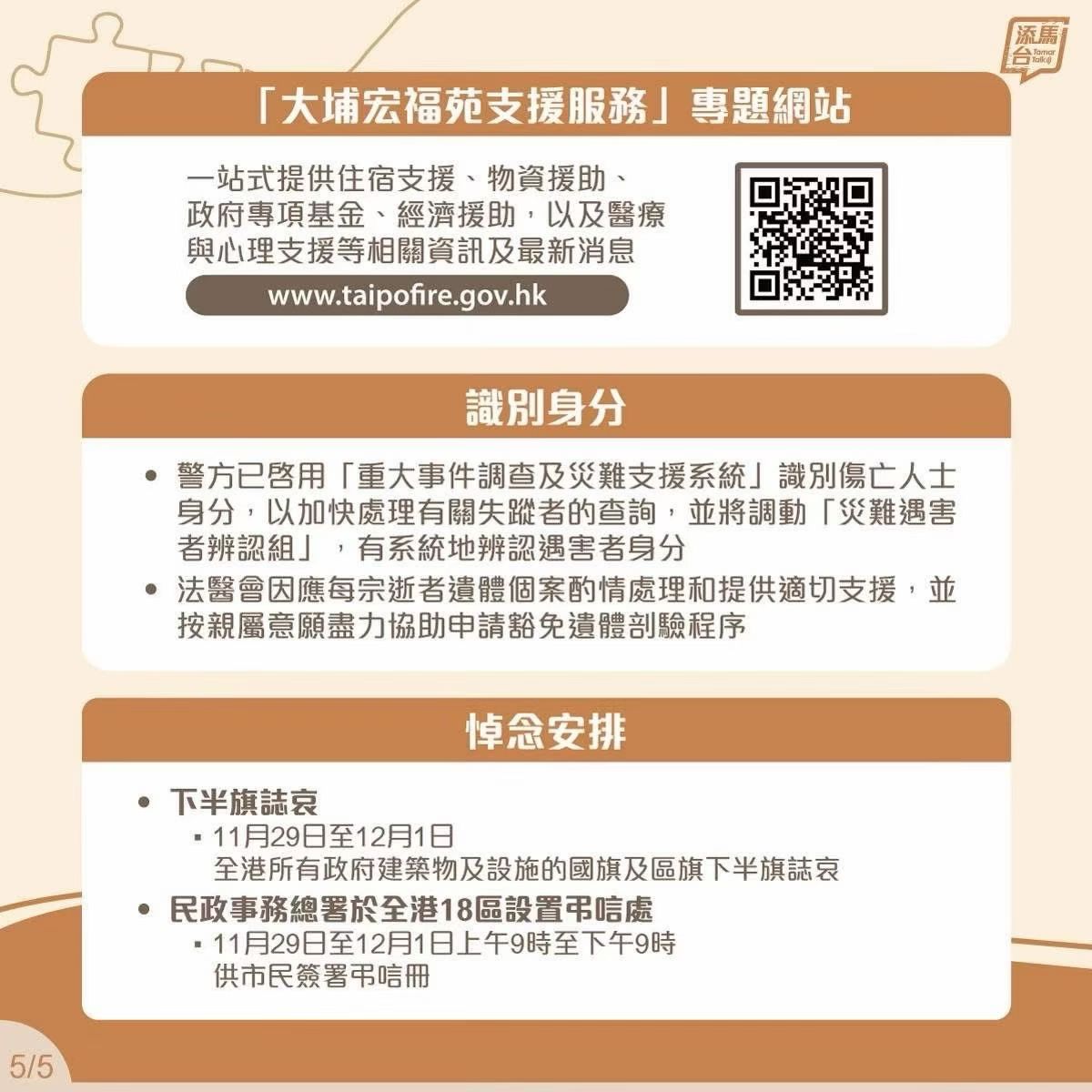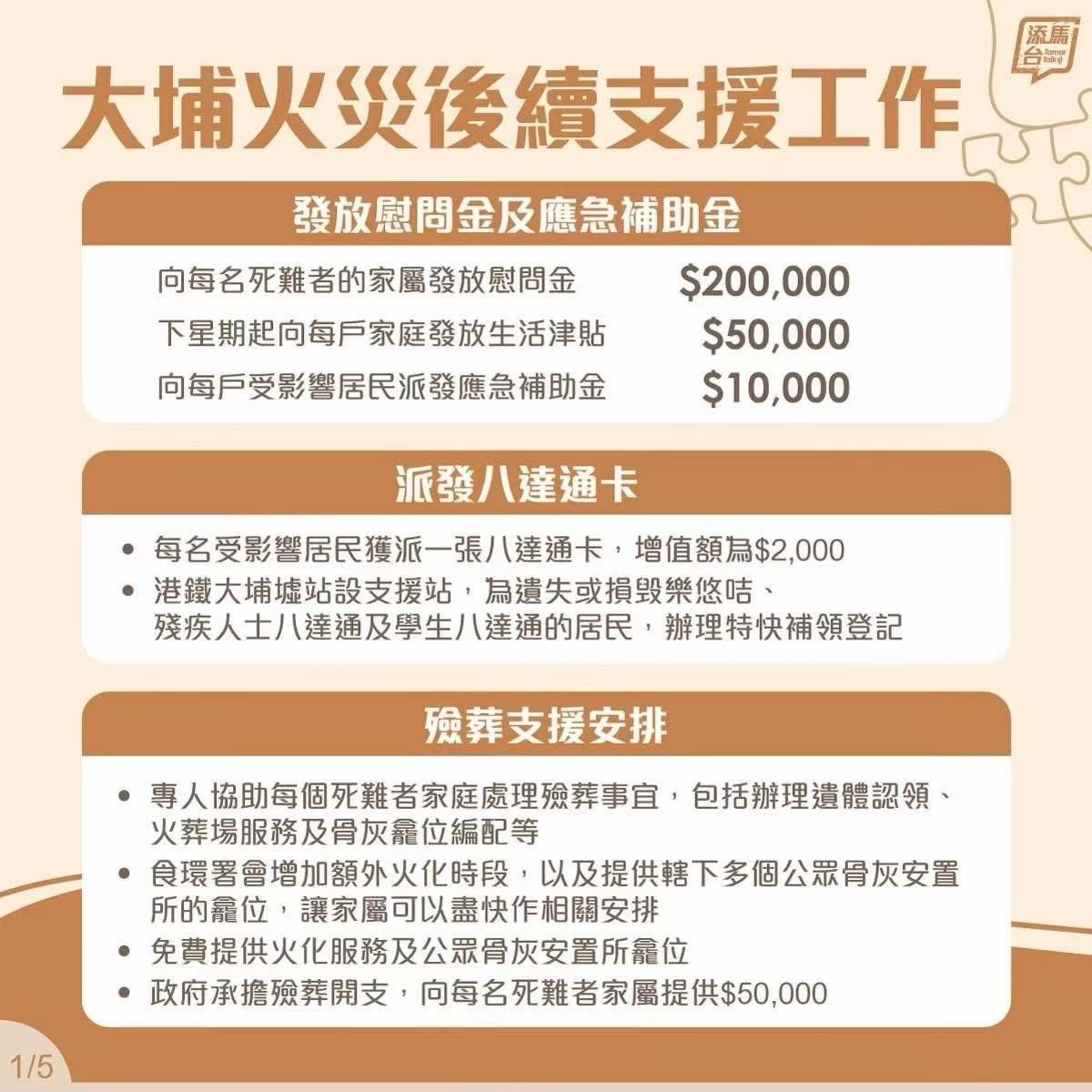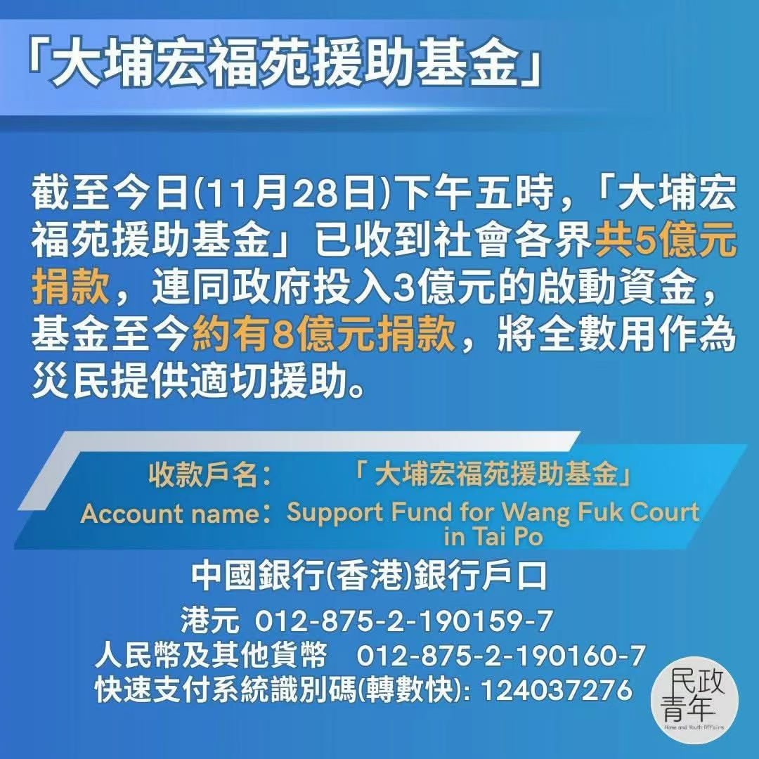 11月26日下午,大埔宏福苑發生五級大火,截至目前已有128人遇難、79人受傷,另有約200人失聯。滅火及救援工作已完成,多個政策局及部門現正集中持續加強後續支援善後工作,從多方面支援受影響居民。