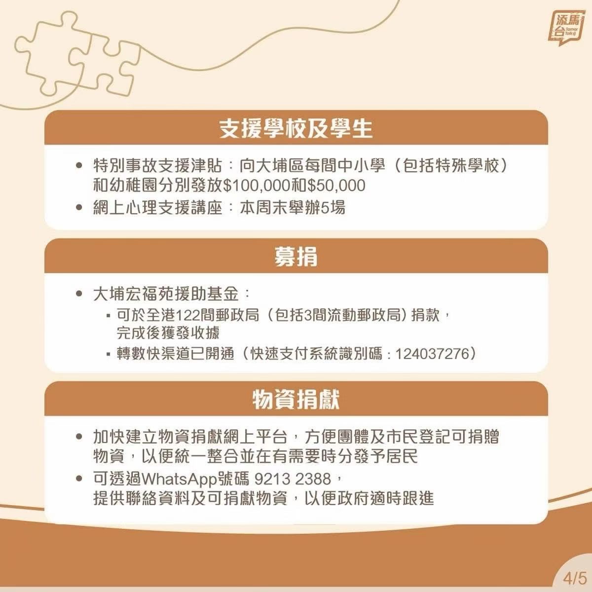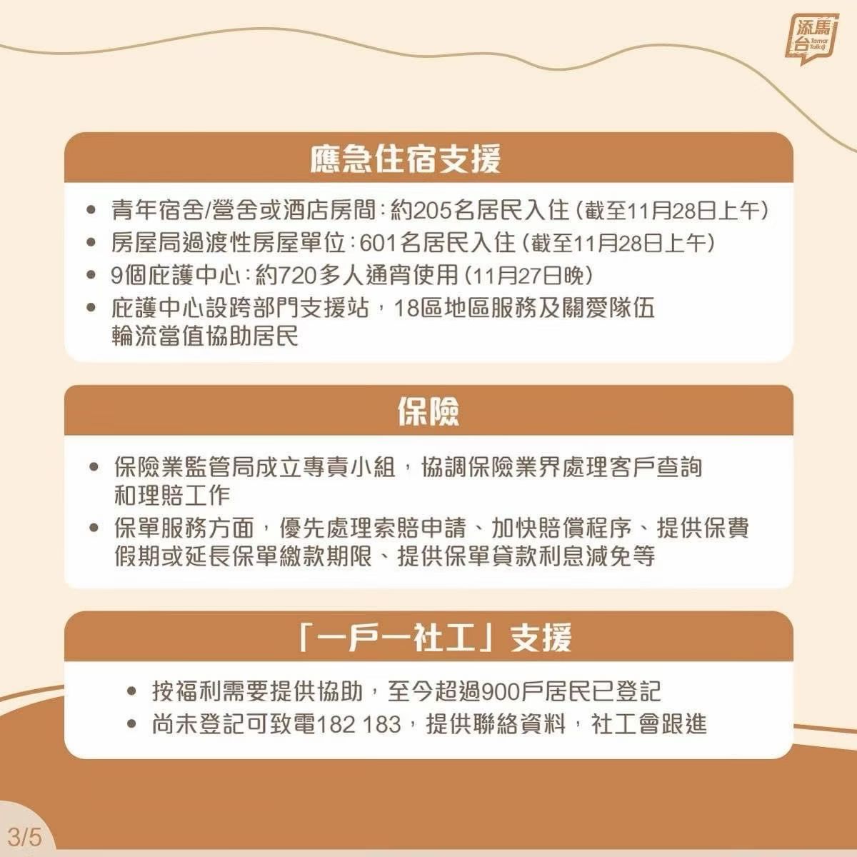 政府已於27日成立調查及規管工作組、緊急支援及募捐工作組,以及應急住宿安排工作組,分別由政務司司長、政務司副司長和財政司副司長領導,積極推展相關工作。財政司司長亦召開金融監管機構統籌會議,商討加強對受影響居民的支援。
