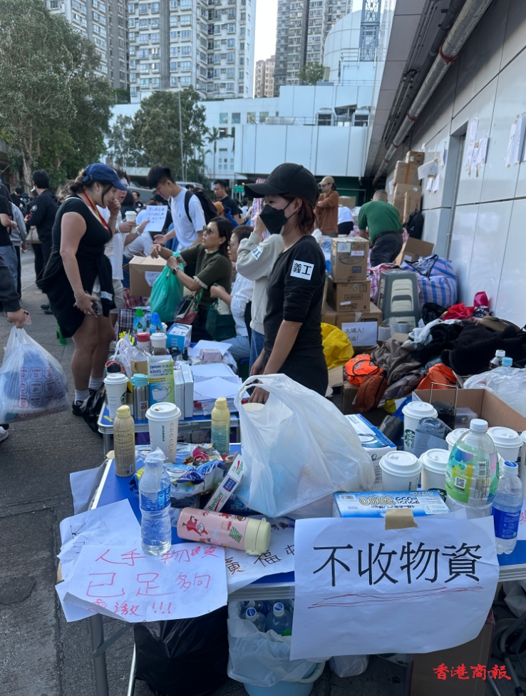 雖然是周末假日,中銀香港還開着門,方便大家捐錢。物資也是多得到處都是,很多地方都掛出了牌子「不再收物資」。有商店的門口也擺放着物資包,有需要的居民可以自己領取。