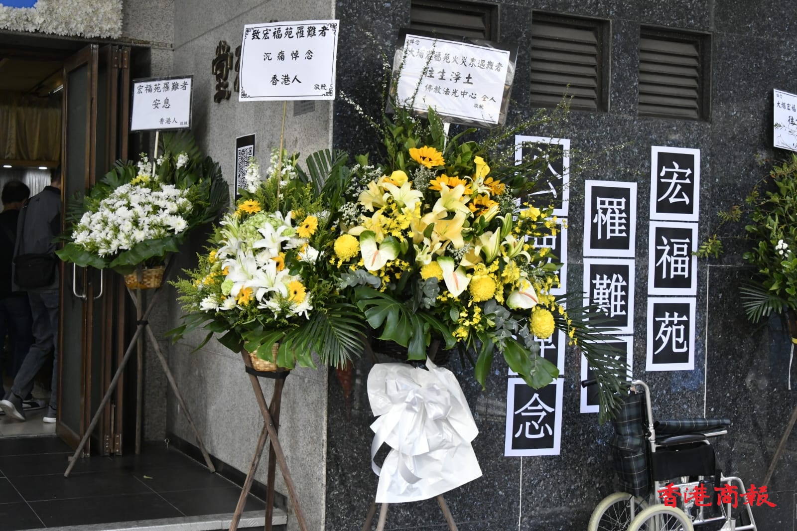 大埔宏福苑上周三(11月26日)發生五級大火,造成逾百人傷亡,今日(12月2日)為罹難者「頭七」,九龍殯儀館舉辦公眾悼念儀式,門口上方掛起寫有「永遠懷念」的橫匾,場外有以「香港人」名義致送的花牌。