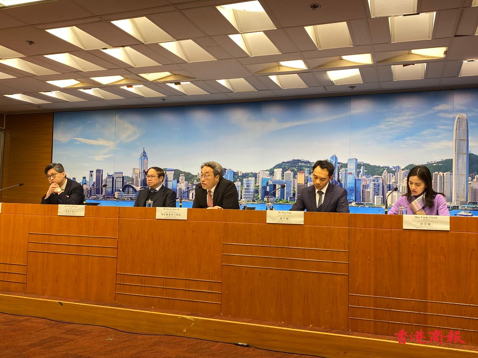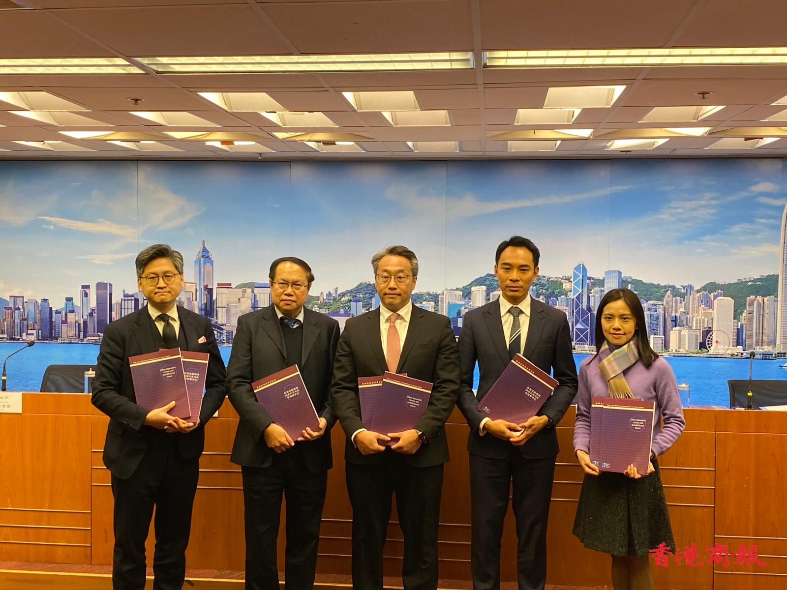 香港法律改革委員會電腦網絡罪行小組委員會主席陳政龍資深大律師(中),電腦網絡罪行小組委員會成員鄒錦沛博士(左二),電腦網絡罪行小組委員會成員鄧子揚(右二), 法改會秘書長黃惠沖資深大律師(左一),電腦網絡罪行小組委員會秘書卓芷穎(右一)。(李銘欣攝)(李銘欣攝)