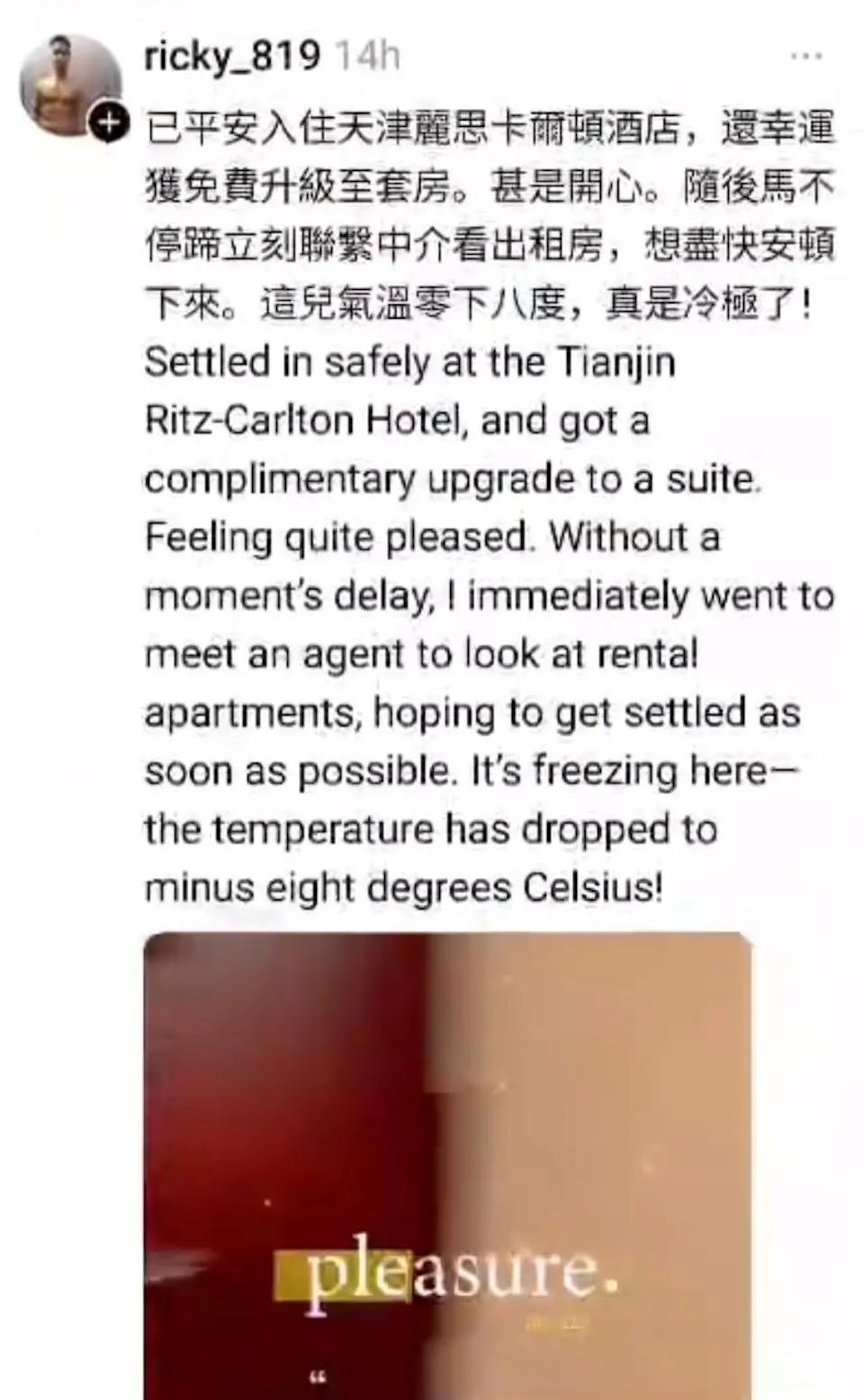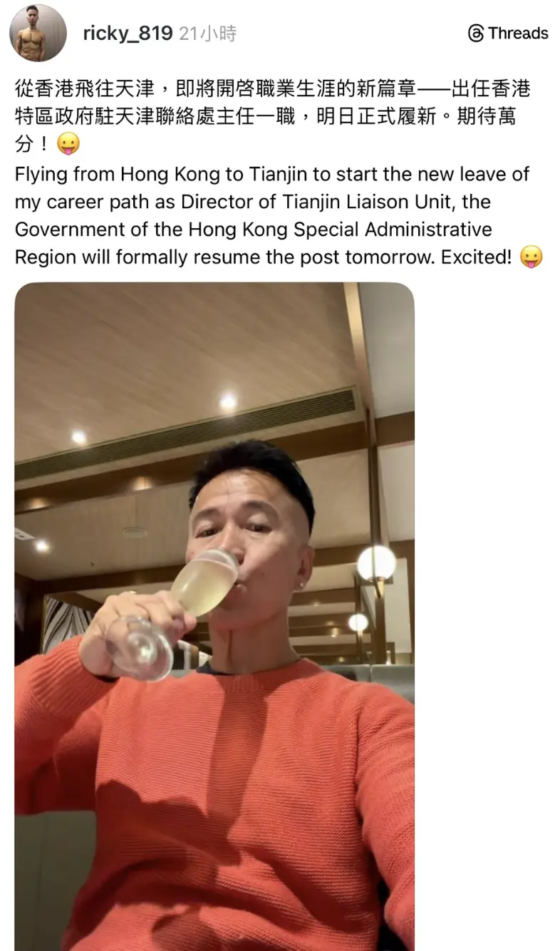 鄭震生19日於社交平台Threads發文表示,將出任特區政府駐天津聯絡處主任一職,入住當地麗思卡爾頓酒店時「幸運獲免費升級至套房」,感到「甚是開心」;他還在去年5月的一篇帖文中分享自己接受噴射飛航高級管理人員安排,乘坐私人艙由香港前往澳門。