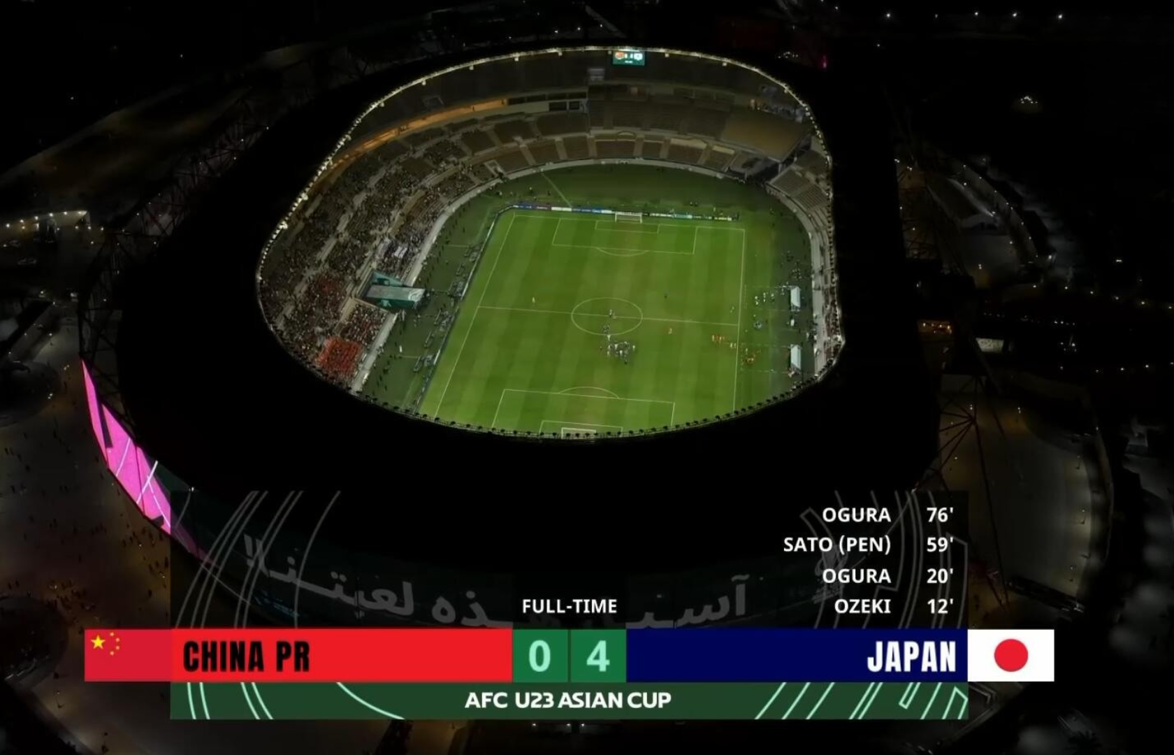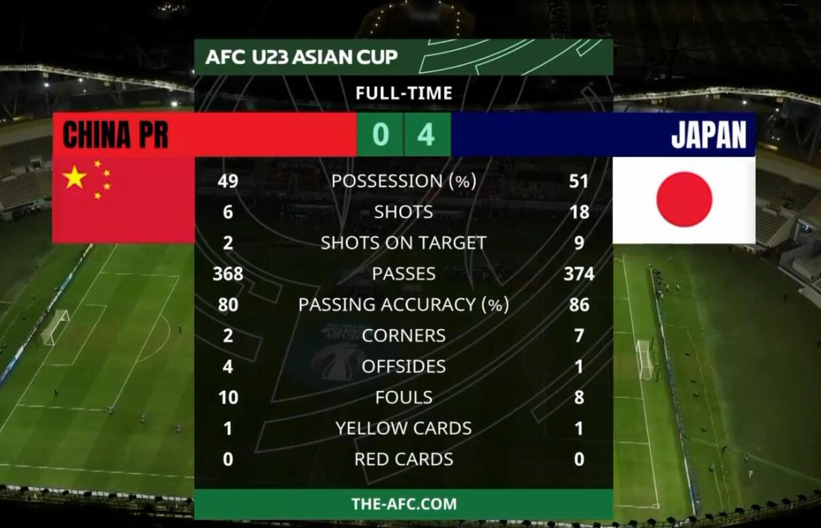 易邊後57分鐘,國足後衛劉浩帆犯手球,日本獲得12碼,佐藤龍之介主罰命中。落後0比3的國足於68分鐘,有楊希門前補射破門,可惜因越位在先,入球無效。76分鐘,小倉幸成禁區外快射得手,個人梅開二度。國足往後時間始終未能破門,結果以0比4見負,雖然錯失冠軍,但收穫亞軍已是刷新隊史參賽最佳戰績。
