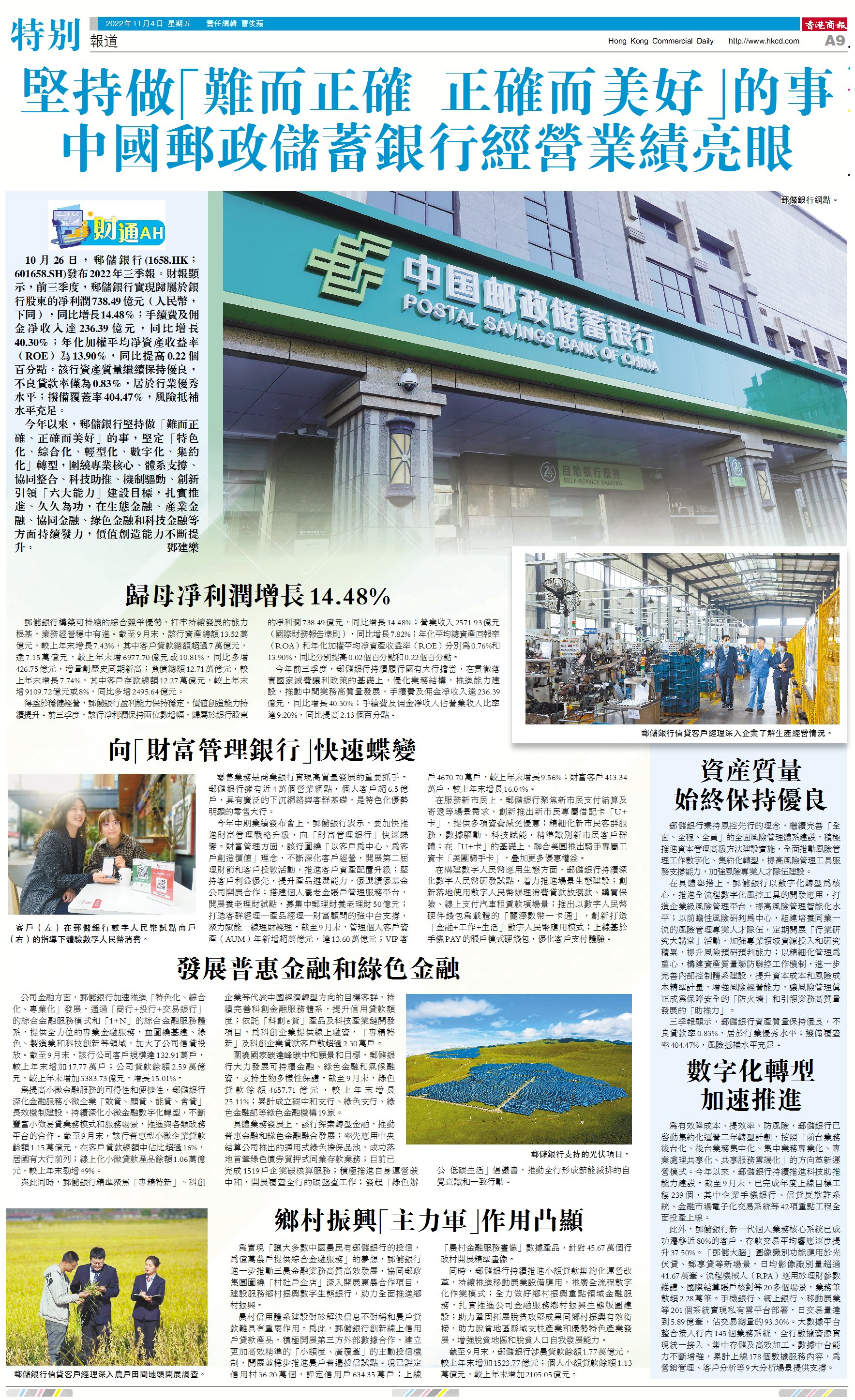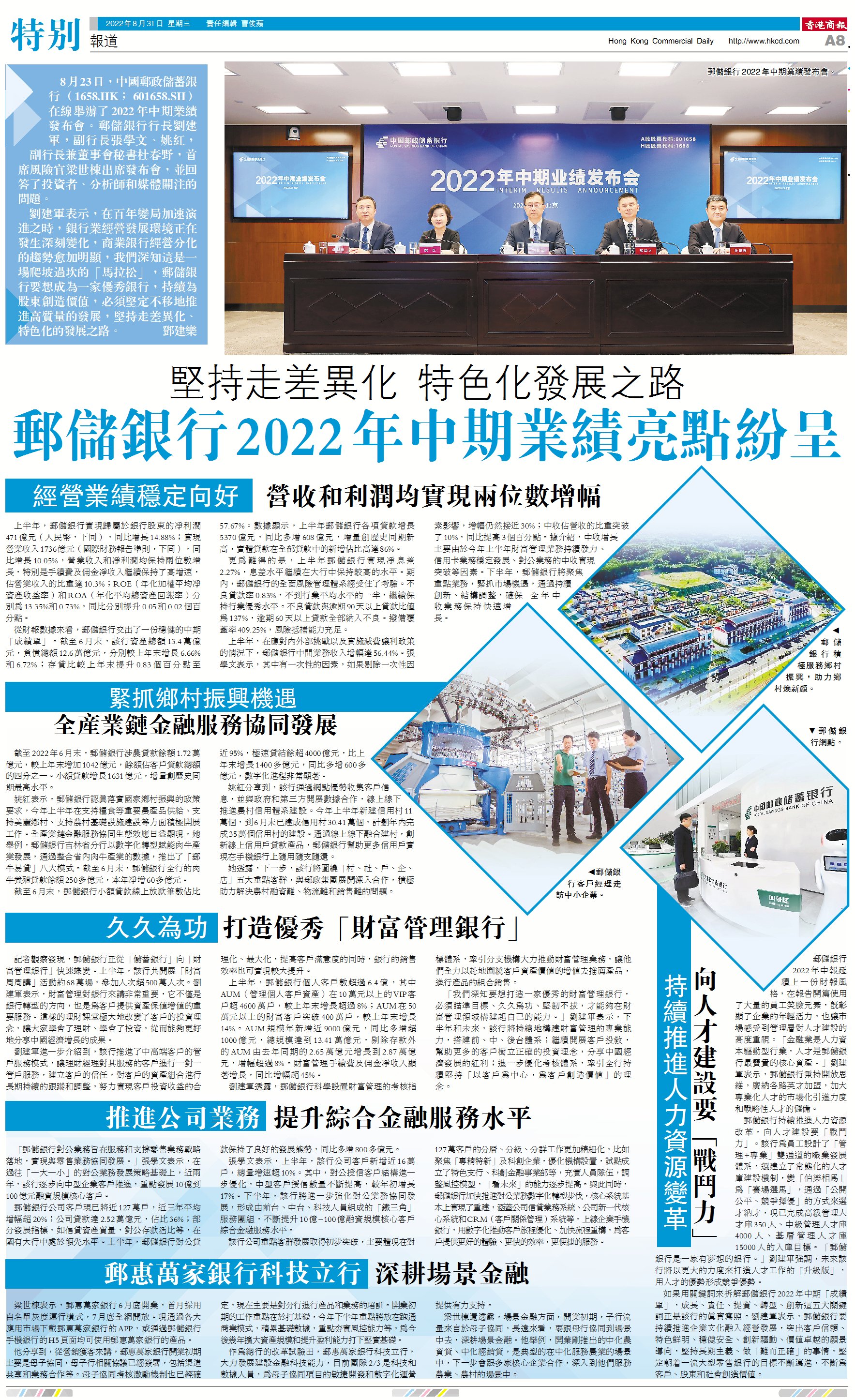 堅持走差異化 特色化發展之路 郵儲銀行2022年中期業績亮點紛呈