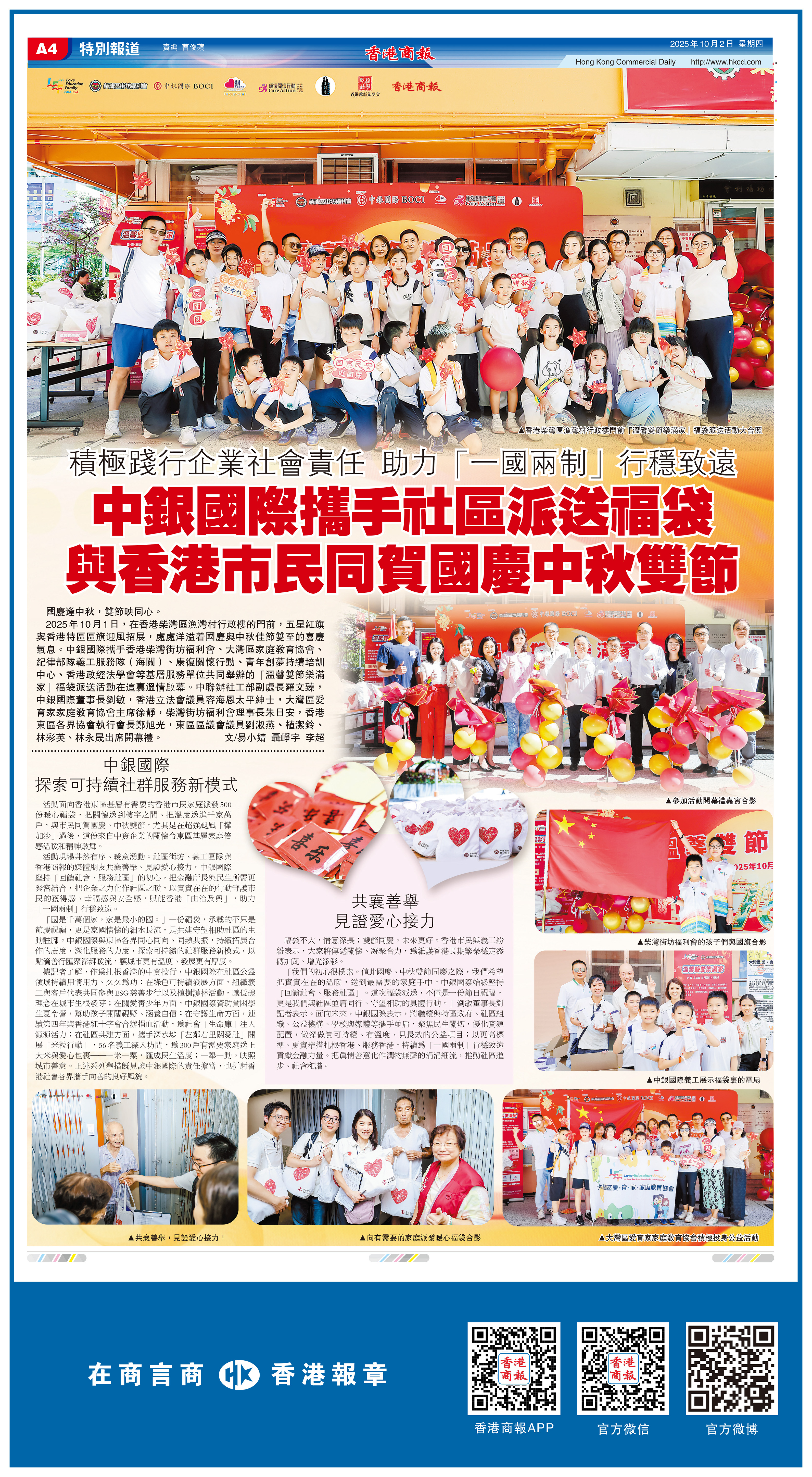 積極踐行企業社會責任 助力「一國兩制」行穩致遠 中銀國際攜手社區派送福袋 與香港市民同賀國慶中秋雙節
