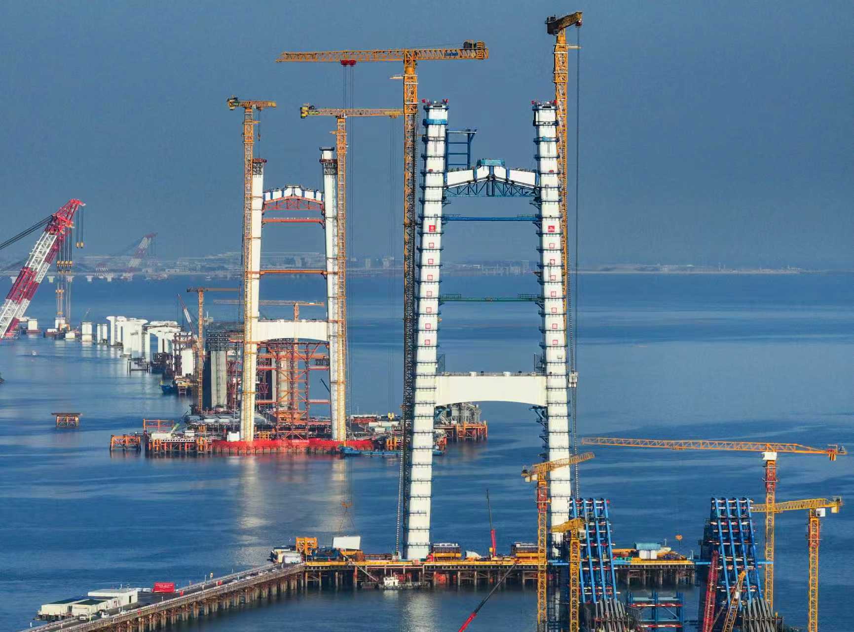 海天相接,高塔擎雲。12月1日,廈金大橋關鍵控制性工程劉五店航道橋主塔完成封頂,標誌着大橋建設取得里程碑式重大進展,從「立塔成型」轉入「懸索成橋」關鍵施工階段,為後續主纜架設、鋼箱梁吊裝等工序奠定堅實基礎。