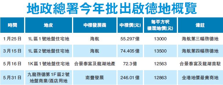 中資鍾愛住宅地,本地大型發展商主攻工商業用地,5月連環有兩幅商業地王誕生。先有恒地(012)於5月16日以232.8億元投得中區美利道商業地,每平方呎樓面地價突破5萬元水平,造價和樓面呎價均是賣地表非住宅用地新紀錄,但造價紀錄僅保持約半個月,便被南豐以246.01億元投得啟德一幅商業、酒店地所打破。