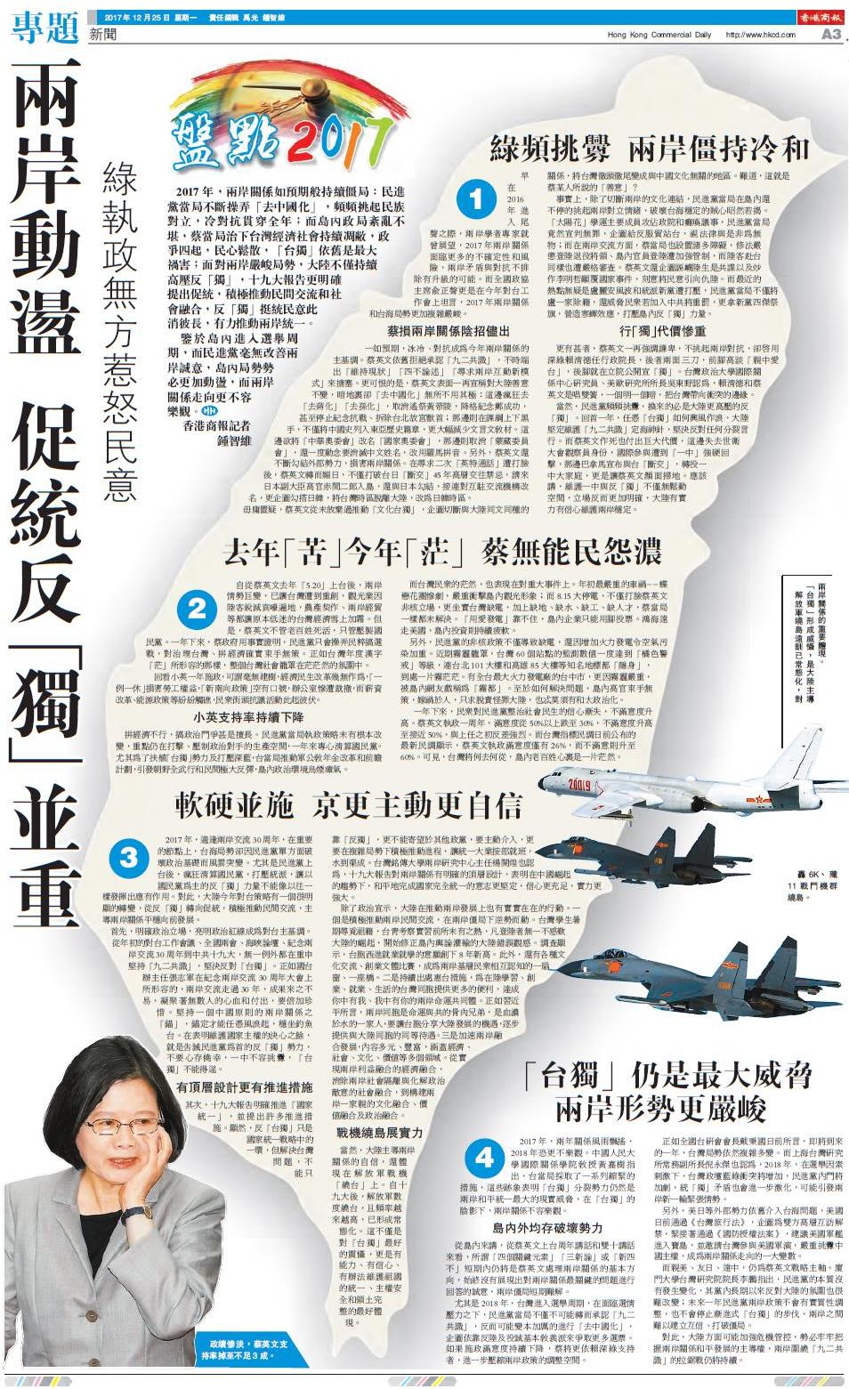 2017年,兩岸關系如預期般持續僵局:民進黨當局不斷操弄「去中國化」,頻頻挑起民族對立,冷對抗貫穿全年;而島內政局紊亂不堪,蔡當局治下台灣經濟社會持續凋敝,政爭四起,民心松散,「台獨」依舊是最大禍害;面對兩岸嚴峻局勢,大陸不僅持續高壓反「獨」,十九大報告更明確提出促統,積極推動民間交流和社會融合,反「獨」挺統民意此消彼長,有力推動兩岸統一。