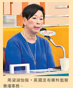 被問及為何中國會拒絕英國外交事務委員會來港一事,周梁表示,中英聯合聲明屬於外交問題,北京有權決定是否同意他們來港了解「一國兩制」的情况。她認為中央政府或是出於外交層面拒絕英國議員來港,因為香港早於1997年回歸中國,外國包括英國,沒有權力監察香港的情况。
