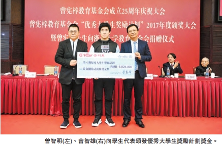 今年是曾憲梓教育基金會成立25周年,1992年,曾憲梓教育基金會由原全國人大常委、香港金利來集團有限公司董事局主席曾憲梓博士捐贈一億港幣,與教育部合作成立,累計捐款超過2.5億元,受資助師生超過5萬人次。2000年起,為支持家境貧寒、品學兼優的大學生完成學業,基金會決定實施「優秀大學生獎勵」計劃,獎勵在內地高等院校就讀的優秀貧困大學生,2000年至2017年,基金會共獎勵了38所內地高校優秀貧困大學生29575人次,資助總額近1.15億元。至今,浙江大學約1000人次的同學獲得資助。