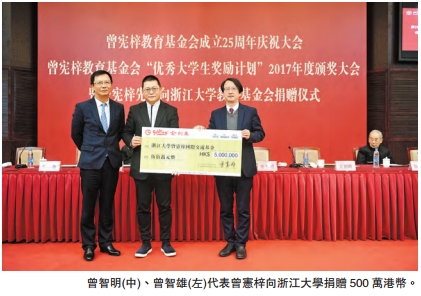 【香港商報网訊】11月24日,曾憲梓教育基金會2017年度「優秀大學生獎勵計劃」頒獎大會暨曾憲梓向浙江大學教育基金會捐贈儀式在浙江大學紫金港校區舉行。來自內地38所高校的1365名優秀大學生獲得總額682.5萬元人民幣的獎勵。當天,浙江大學教育基金會收到曾憲梓捐贈的500萬港幣。