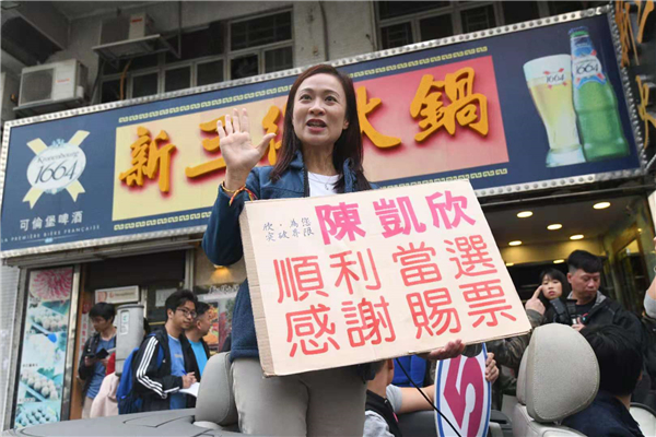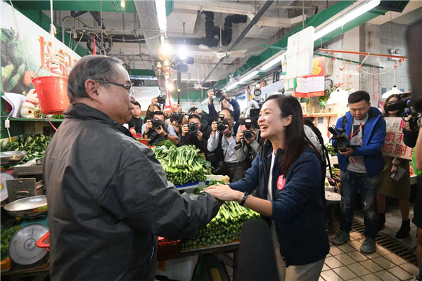【香港商报网讯】在立法会九龙西补选胜出的陈凯欣,下午到九龙城谢票。她到九龙城街市向市民及档贩致谢,又与支持者合照。陈凯欣感谢所有投票支持她的选民,指已收到立法会秘书处通知,星期三便要宣誓,工作马上要展开。