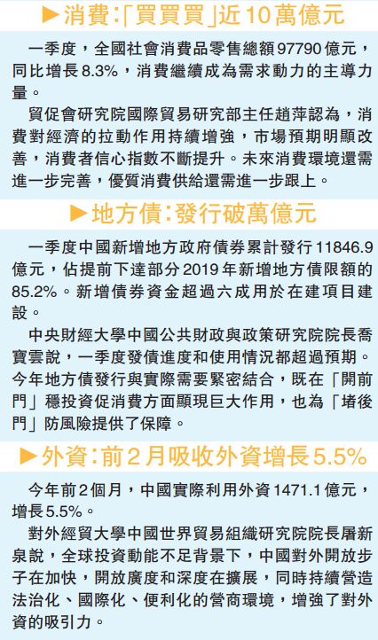 【香港商報网訊】記者伍敬斌報道:國家統計局昨日發布今年一季度中國GDP數據。據初步核算,一季度國內生產總值213433億元,按可比價格計算,同比增長6.4%,與上年四季度相比持平。專家認為,今年一季度中國的GDP再次證明了中國經濟的潛力和韌性,這得益於此前採取的一系列貨幣政策以及財政政策的發力。到目前為止,政策的效應仍然沒有完全釋放,所以接下來中國的經濟增速仍然可能有小幅上升。不過,中國的經濟刺激政策應該不會繼續加碼,未來的政策重心更可能是穩住目前的局面,向供給側改革進一步發力,並對經濟結構的進一步調整,尤其是朝着高質量發展目標前進。