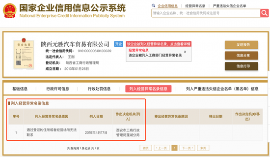 北青报记者注意到,截至4月19日,该企业的工商信息已显示“被列入经营异常名录”,列入经营异常名录的原因为:通过登记的住所或者经营场所无法联系;列入日期为4月17日;做出决定的机关为:西安市工商行政管理局莲湖分局。