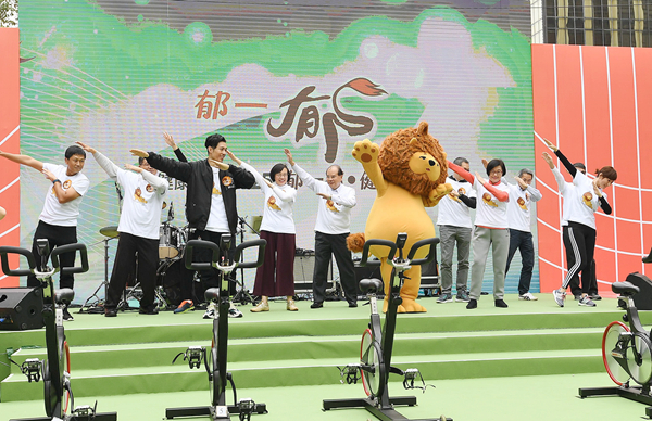 食衛局局長陳肇始(左四)與官員齊做運動。