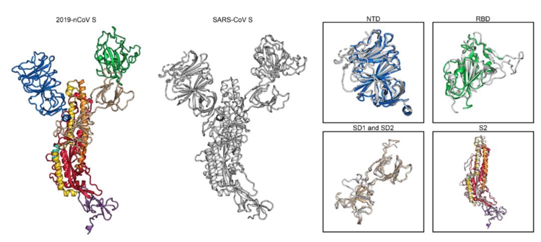 通过与SARS病毒的结构比较,研究人员发现新型冠状病毒的S蛋白与SARS病毒的在结构上存在差异,但是整体上看相似度很高。从S蛋白的三聚体来看,新型冠状病毒的三聚体更容易与细胞表面的ACE2蛋白结合。