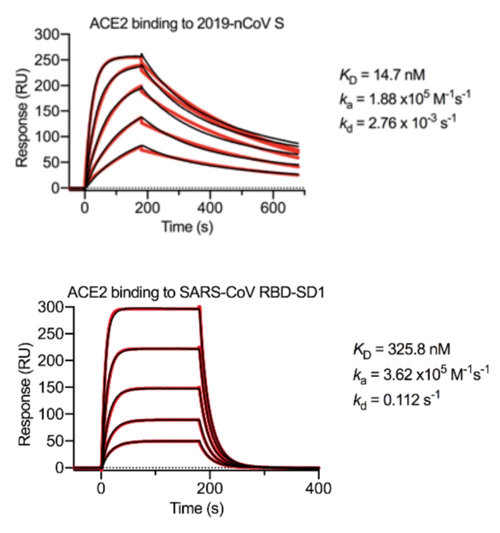 让McLellan和他的同事感到吃惊的是,通过表面等离子共振技术(SPR)分析得到的结果。新型冠状病毒S蛋白与ACE2的平衡解离常数KD是15 nM,而SARS病毒S蛋白与ACE2的平衡解离常数KD竟然达到了325.8 nM。