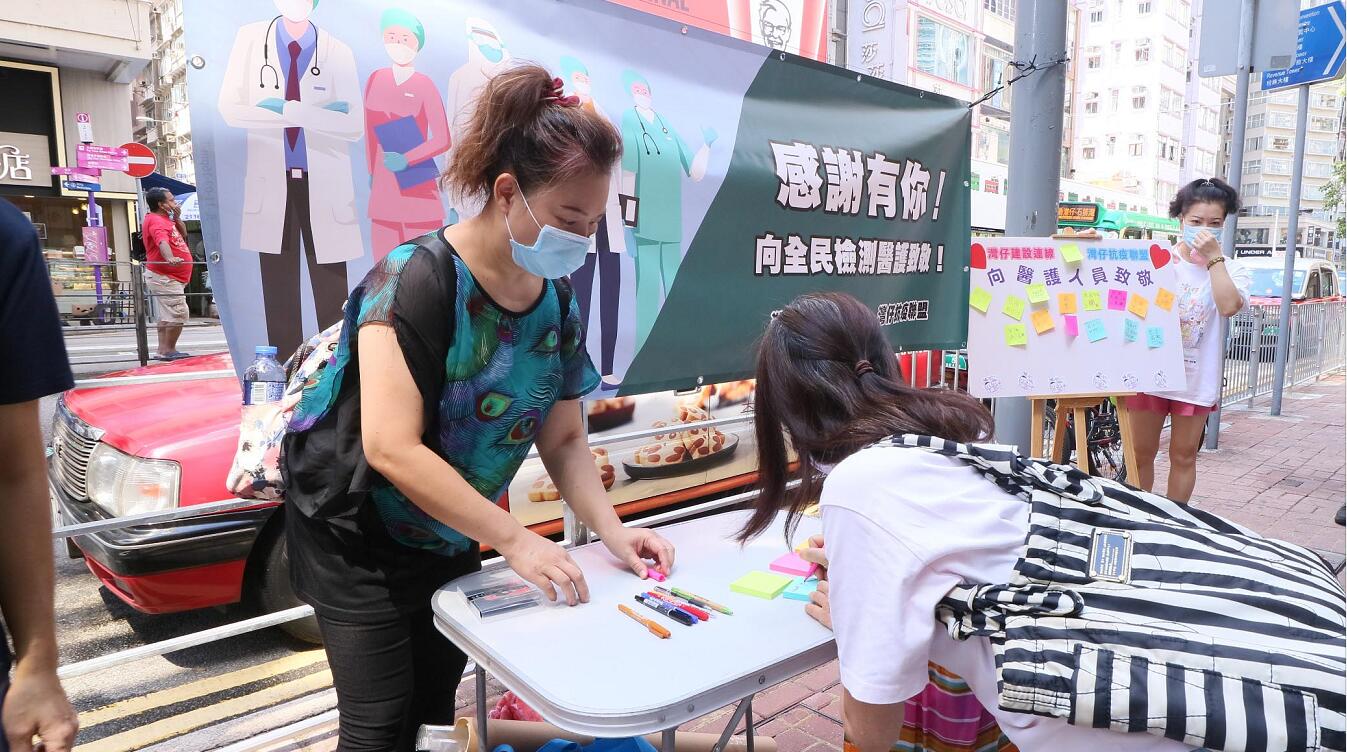 內地支援隊員在臨時休息區觀看香港市民送來的心意卡。