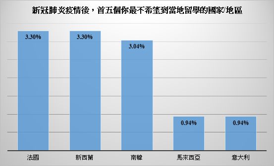 調查同時問及最不受歡迎的升學目的地,結果顯示法國和新西蘭位列第1,有3.3受訪者選擇、韓國排名第2,有3.04%受訪者選擇、馬來西亞和意大利位列第3,有0.94%受訪者選擇。