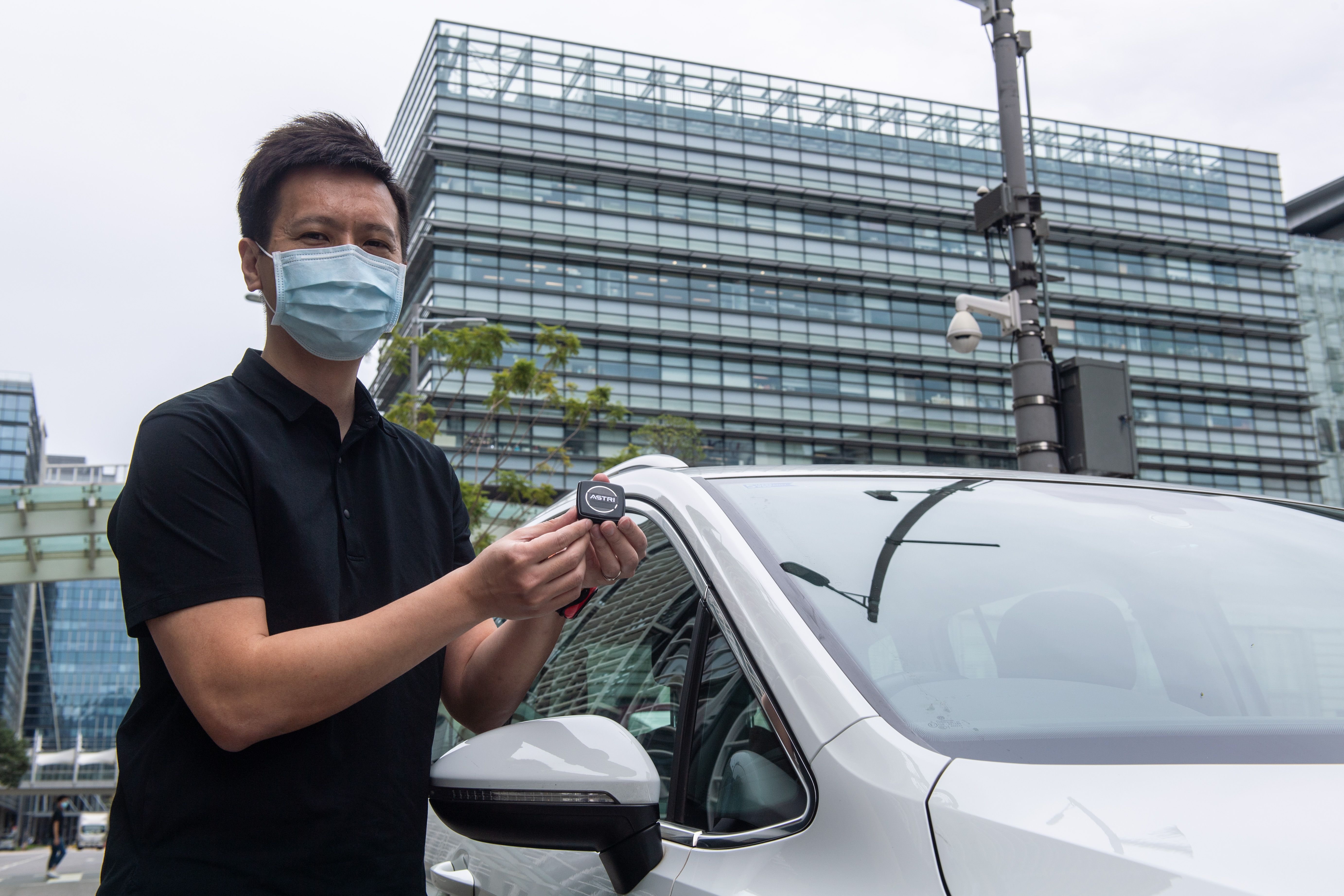應科院設計的電子道路收費系統,透過將感應器安裝在路旁設施(如圖後方燈柱上的白色裝置)及將應科院車聯網研發副總監陳少平手持的儀器安裝在車輛上運作。