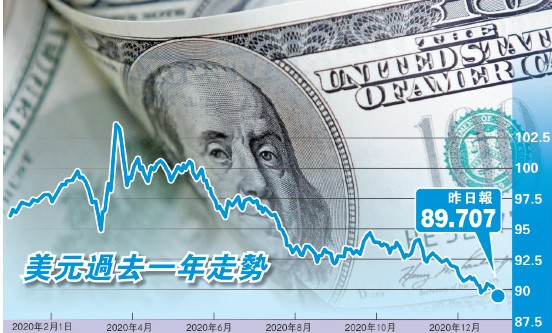 回顧2020年美元走勢,可以用一個詞概括,就是「弱勢」。反映美元兌一籃子貨幣的美匯指數,去年底處於96水平,2020年首季更是走勢反覆,低位見94.65,高位曾衝至102.99,主因當時3月份全球不少地區疫情大爆發,恐慌情緒引發金融市場出現流動性危機,美元成為避風港而一度飆升。