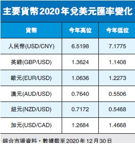 疫情變化令2020年金融市場經歷不少波動,向來被視為避險資產之一的美元,在疫情下反而未能發揮避險效用,美匯指數持續下跌。相反,中國內地疫情全面受控,經濟走出谷底,帶動人民幣創逾兩年高位,更有進一步升值預期;其他主要貨幣則走勢不一。踏入2021年,市場憧憬疫苗將大規模接種,加上英國達成脫歐協議,環球經濟料即將重啟,將如何影響主要貨幣表現?