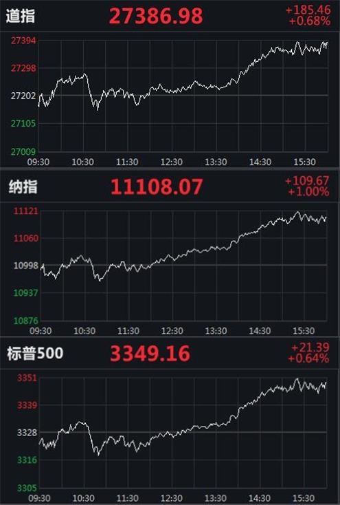 截至收盤,道指漲185.46點,漲幅0.68%,報27386.98點;納指漲109.67點,漲幅1.00%,報11108.07點;標普500指數漲21.39點,漲幅0.64%,報3349.16點。