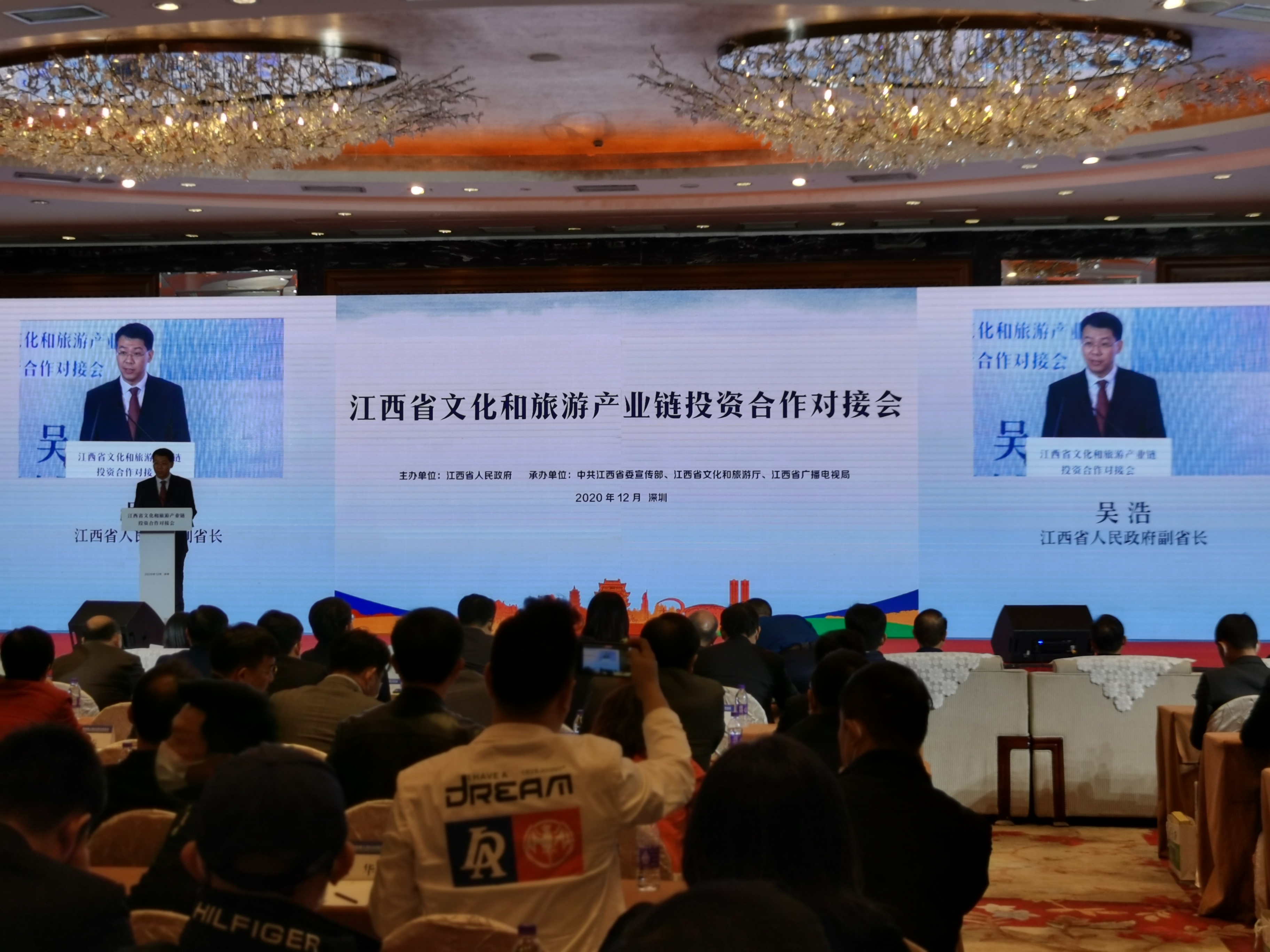 12月3日下午,由江西省人民政府主辦,江西省委宣傳部、江西省文化和旅遊廳、江西省廣播電視局承辦的「2020江西文化和旅遊產業鏈投資合作對接會」在深圳香格里拉酒店舉辦。這是「2020江西省對接粵港澳大灣區經貿合作活動」的重要組成部分。江西省人民政府副省長吳浩出席推介會並致辭。深圳市委宣傳部常務副部長陳金海,江西省委宣傳部常務副部長郭建暉,深圳報業集團黨組副書記、副社長、總經理王躍軍,深圳廣播電影電視集團黨組副書記、總經理劉璋飆,深圳市委宣傳部文改處處長蔡東峻,香港銅鑼灣集團董事會主席陳智,深圳市文化創意行業協會常務副會長、澳門愛國教育總會主席、澳門和飛控股集團董事局主席李菲,中國文化產業園區聯盟副主席黃琥等出席會議。