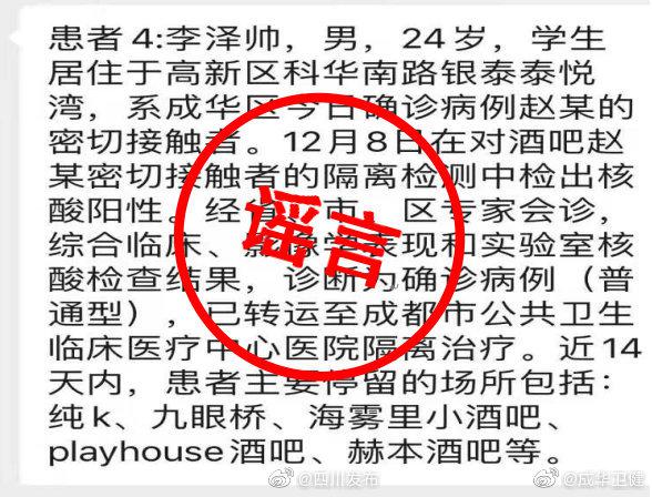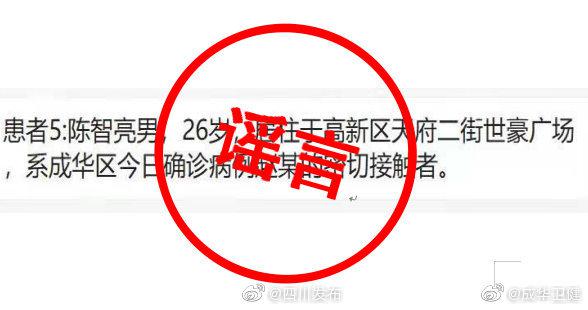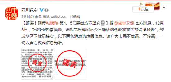 據@成華衛健 官方消息,12月8日,針對網傳「李澤帅、陳智亮為成華區今日確診病例趙某某的密切接觸者」,經成華區衛健局核實,以下兩條消息為虛假信息。請廣大市民不信謠、不傳謠,一切以官方權威信息為准。