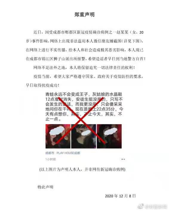 「青蛙永远不会变成王子,灰姑娘的水晶鞋12点回准时消失。」12月8日,多条关于成都一20岁女性感染者赵某的谣言也随之而来。其中,就有一条朋友圈截图在网络上广泛转发,引起关注。这一朋友圈的「主人」在网络上发布声明闢谣称,自己的朋友圈截图被「冒用」了。