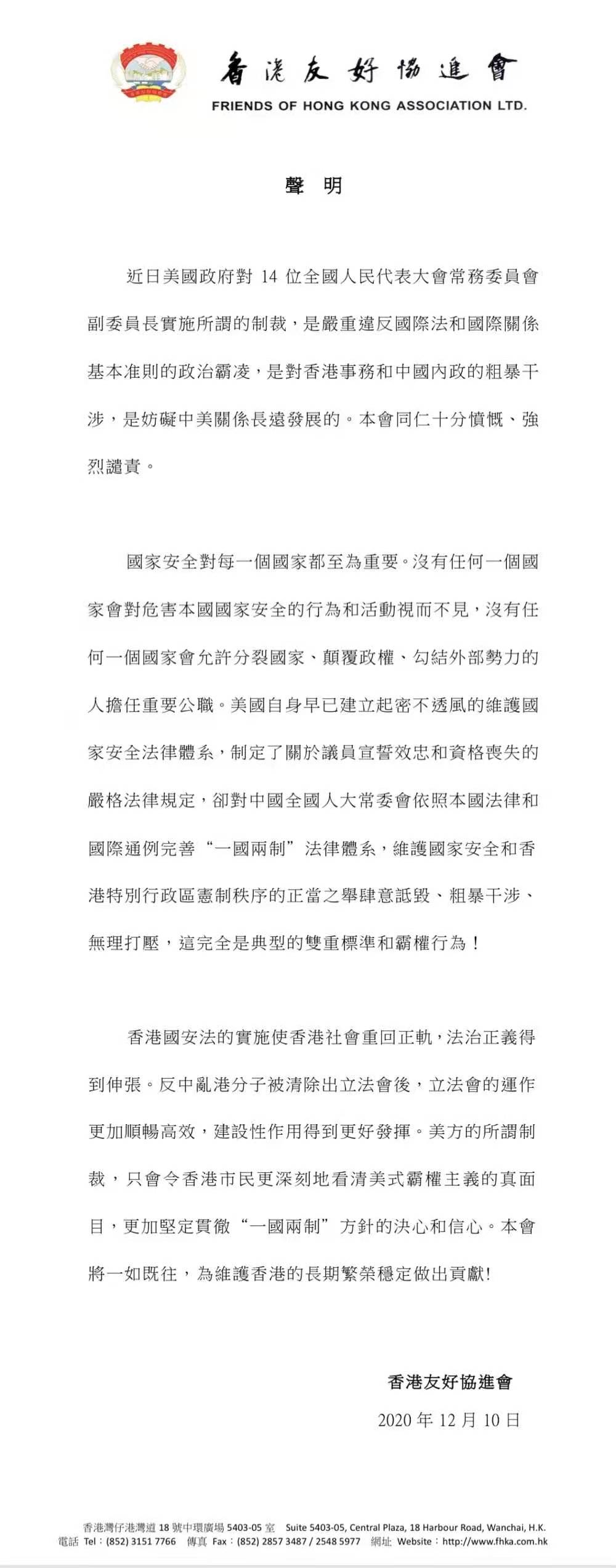 12月8日,美方以涉港問題為由宣布對14位中國全國人大常委會副委員長實施制裁。對此,香港友好協進會今日(10日)發表聲明,強烈譴責美方霸淩行徑。該會表示,美國自身早已建立國安法律體系,卻對中國維護國家安全的正當之舉肆意詆毀、粗暴干涉、無理打壓,這完全是典型的雙重標準和霸權行為。