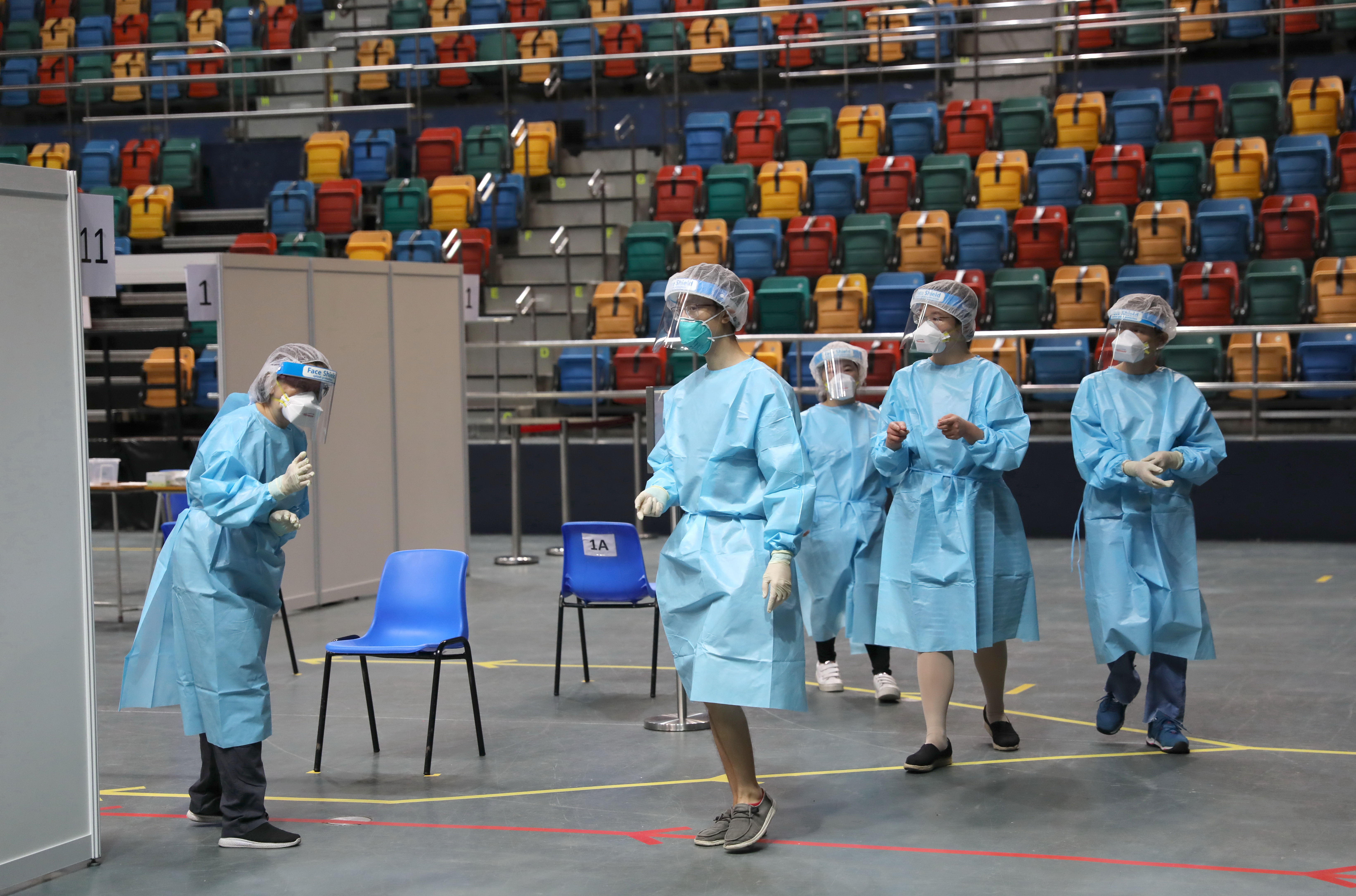 普及社区检测计划期間,工作人员在香港伊利沙伯体育馆检测中心忙碌 新华社