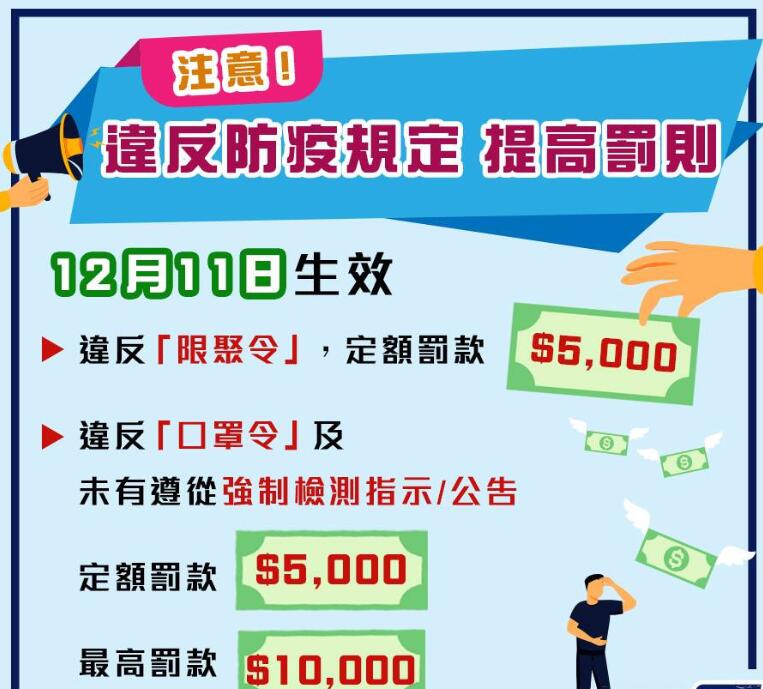 本港新冠肺炎疫情嚴峻峰,為確保市民嚴守各項防疫規定,港府早前宣布,由昨日(11日)起,參加受禁群組聚集、在公共交通具上或指明公眾地方未有佩戴口罩、不遵從強制檢測指示/公告的定額罰款,將由2000元提高至5000元。違反後兩者的最高罰款亦增至10000元。