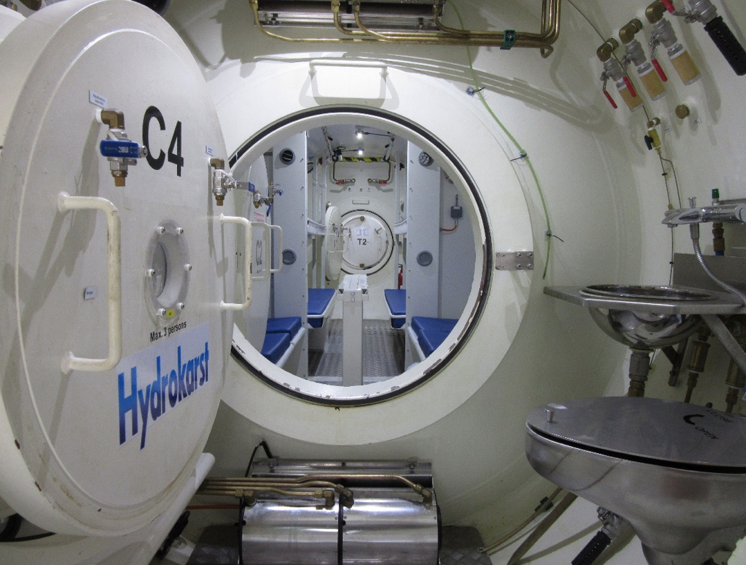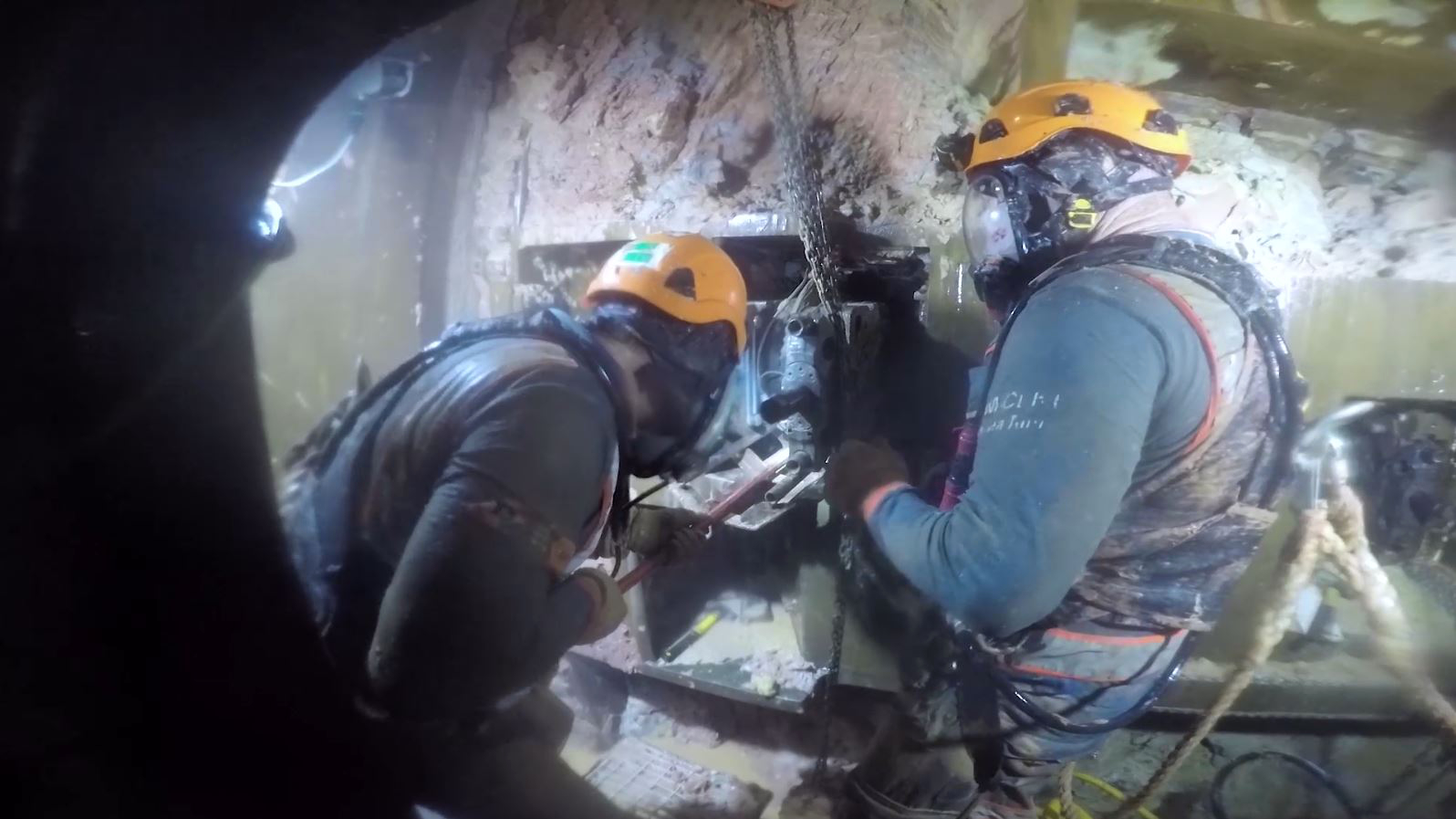 接受過專業訓練的加壓工程人員在鑽挖艙內更換刀具。