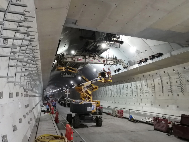 在隧道內組裝預製的架抽風管道面板。