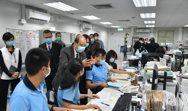 張建宗(右三)在建築署署長何永賢(右四)及民眾安全服務處總參事方耀堂(右二)的陪同下,視察分派飯盒的情況。