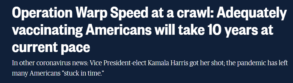 美媒報道稱,美國疫苗如果繼續按目前的速度推進,大約需要十年時間才能完成足量美國人的疫苗接種工作,並使新冠疫情得到控制。美國原計劃在明年6月前為2.64億美國人接種,但到目前為止,只有大約200萬人完成第一劑的接種工作,其中大部分接種者還是一線醫療工作者和一些療養院的居民。