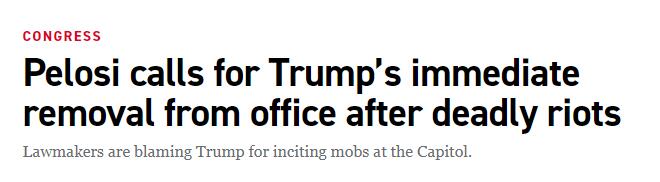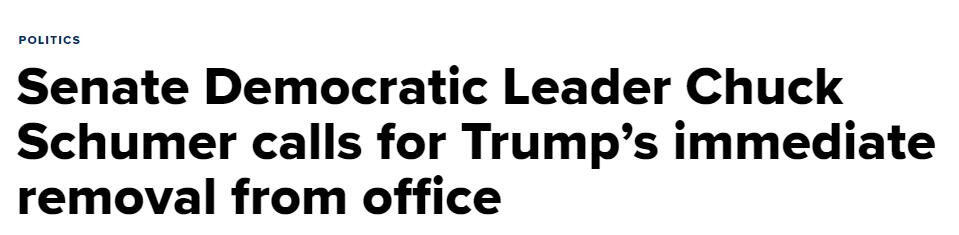 稍後,美国众议院议长南希·佩洛西(Nancy Pelosi)加入舒默行列,呼籲副总统迈克·彭斯(Mike Pence)和内阁使用《第二十五条修正案》,立即将总统唐纳德·特朗普免职。