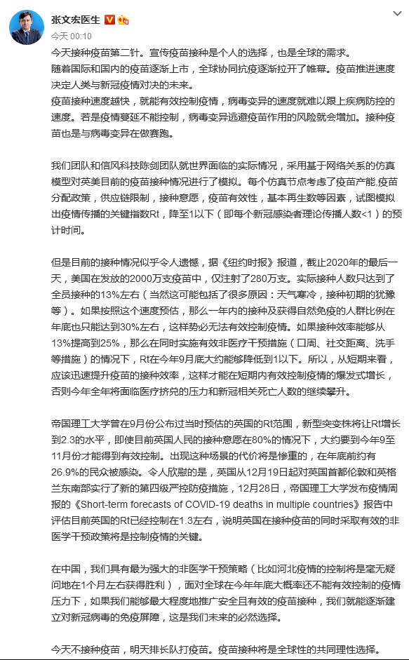 12日淩晨,復旦大學附屬華山醫院張文宏醫生發布微博指,中國具有最為強大的非醫學干預策略,比如河北疫情的控制將是毫無疑問地在1個月左右獲得勝利。