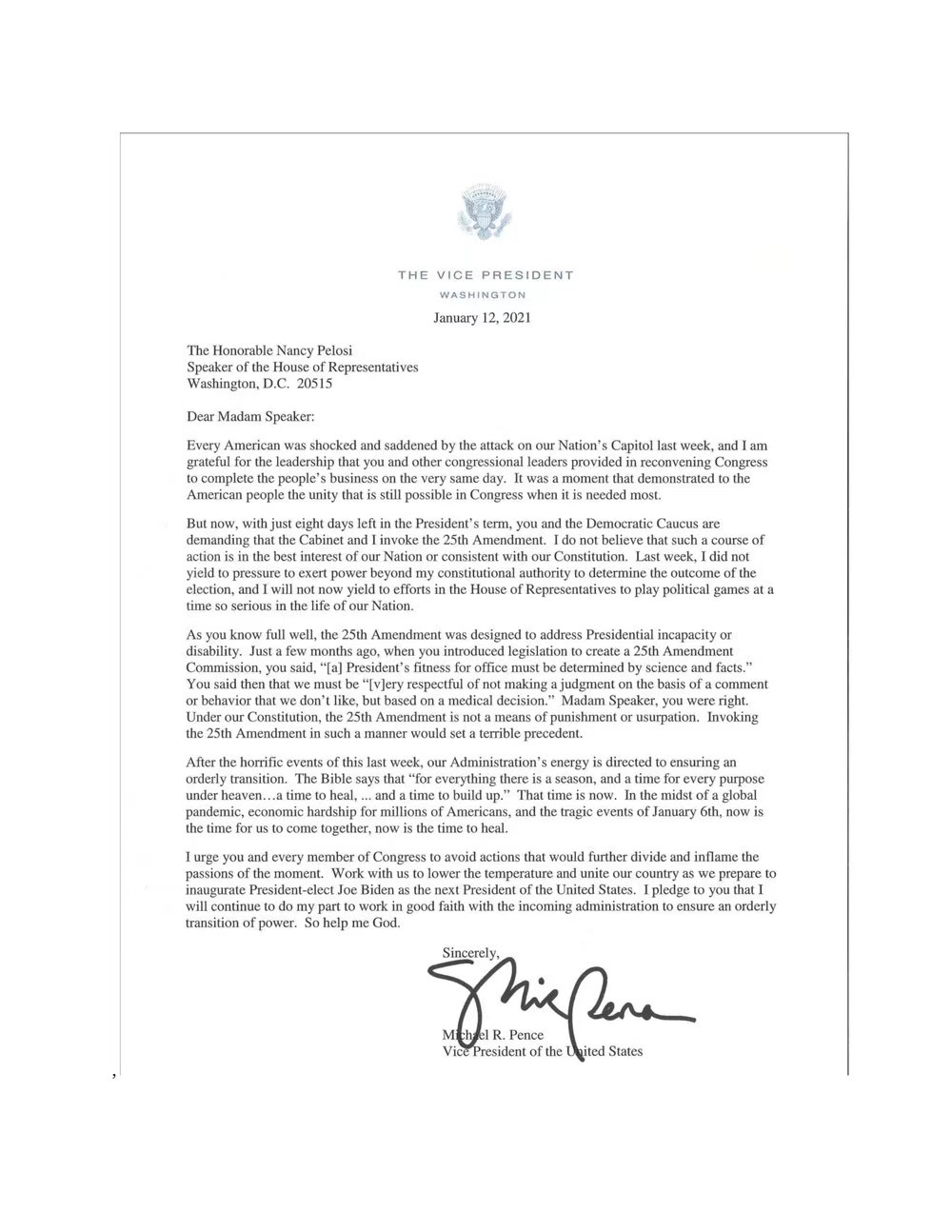 然而,彭斯12日在致美國眾議院議長佩洛西的信件中已經表示,不會啟動第25條修正案將特朗普免職,他指出「不認為這樣的行動符合我們國家的最佳利益,也不符合我們的憲法」。