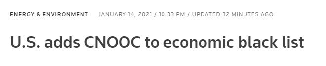 美國商務部周四表示,已將中國海外石油總公司(CNOOC)列入黑名單,稱其幫助中國「在南海威脅鄰國」。