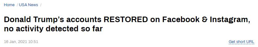 「今日俄羅斯」(RT)消息,臉書公司悄悄恢復了美國總統特朗普的臉書賬戶和Instagram賬戶。國會騷亂之後,特朗普在這兩個社交平台上的賬戶被凍結。報道稱,當地時間1月15日晚些時候,特朗普在這兩個平台上的賬戶被恢復。RT稱,Instagram及其母公司臉書方面均未對這一突然舉動做出任何解釋。
