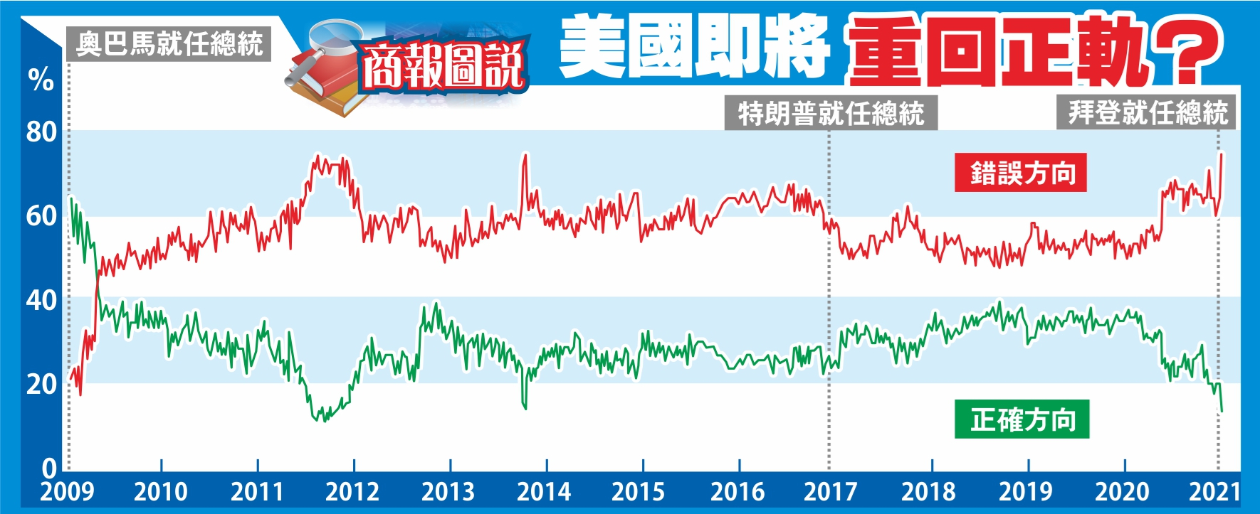 其中,特朗普上任初期,確為美國帶來一段蜜月期,至少認同朝正確方向者的比率,一度重新攀至30%以上;惟特朗普一直無法妥善應對新冠肺炎疫情,所以自2020年後相關比率明顯急跌,最新更跌穿了20%的大關,反之覺得國家朝錯誤方向者,則急飆至逾70%的近10年最高。
