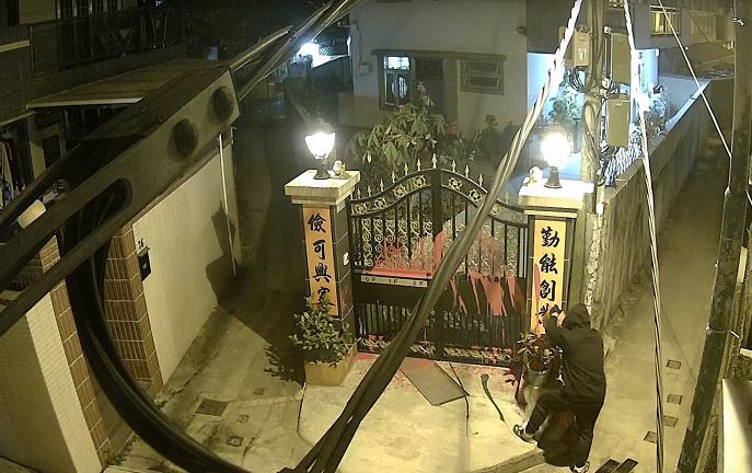 根據村民提供的閉路電視錄影片段可見,事發在今日淩晨約3時57分,4名身穿連帽外套及鴨舌帽的兇徒,分作2人一組,手持用膠袋盛載的油桶,到涉案村屋外,圍繞外牆將油淋上牆上和村屋內範圍,以及在鐵閘上淋滿紅油,最後連盆栽亦不放過,逞凶後還將盛油桶的膠袋帶走,犯案手法純熟,其後往停車場方向離去。